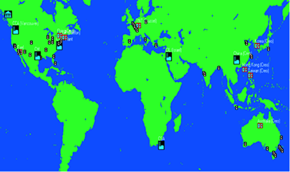 - Map of world wide network with distribution centers (DCs), customer demand by regions and manufacturing plants locations: